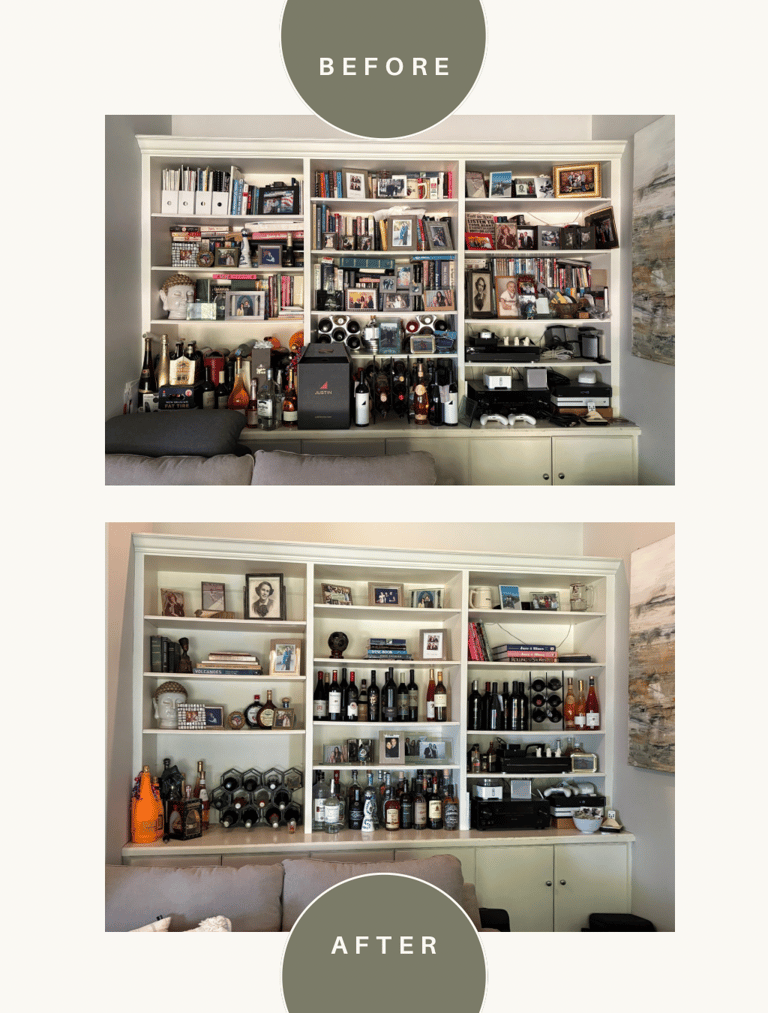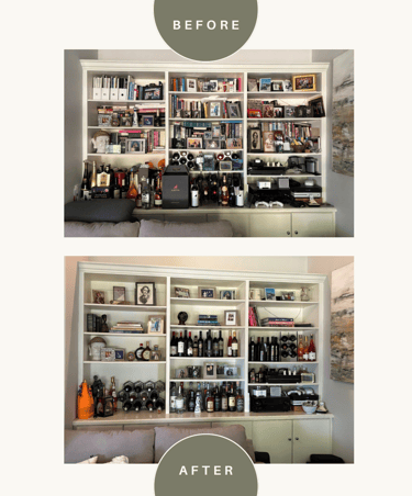 Need a fast reset? My 4-Hour Refresh is ideal for giving any space a cleaner, calmer feel. This living room was filled with unorganized bottles, picture frames, and old books. In just four hours, we created order and flow—without removing anything the client wasn’t ready to part with.